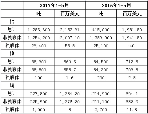 以下為俄羅斯聯邦海關服務機構(FCS)提供的2017年1-5月鋁、鎳和銅出口量數據: