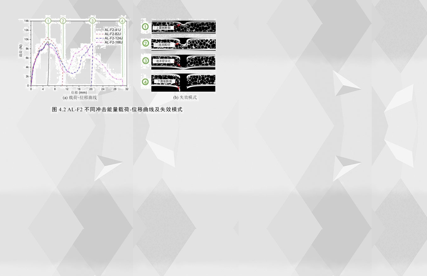 圖4.2為AL-F2在不同沖擊能量下的載荷-位移曲線及失效模式,AL-F2在166J沖擊能下試件完全穿透,其載荷-位移曲線有兩個峰值載荷,結(jié)合其在不同沖擊能量下最終損傷CT掃描圖,如圖4.2(b)所示,可以將結(jié)構(gòu)響應(yīng)分為三個階段,第一階段為沖頭接觸到上面板到抵達(dá)第一次峰值載荷,由于這個過程半球狀沖頭與面板的接觸面積不是線性增長且面板逐漸發(fā)生塑性變形,所以此階段的載荷呈非線性增長,當(dāng)上面板出現(xiàn)裂紋時,如圖4.2(b)中①,載荷到達(dá)第一個峰值載荷;第二階段為第一次峰值載荷到第二次峰值載荷,在此階段的前半階段載荷持續(xù)下降到波谷,主要的失效模式為上面板裂紋的出現(xiàn)以及擴(kuò)展,與此同時,泡沫芯層受到一定程度的壓潰,在第二階段的后半階段,由于泡沫鋁芯層被壓實至密實化,如圖4.2(b)中③所示,載荷再一次持續(xù)上升;第三階段即為第二次峰值載荷之后,開始于下面板出現(xiàn)裂紋到結(jié)構(gòu)完全失去承載能力。